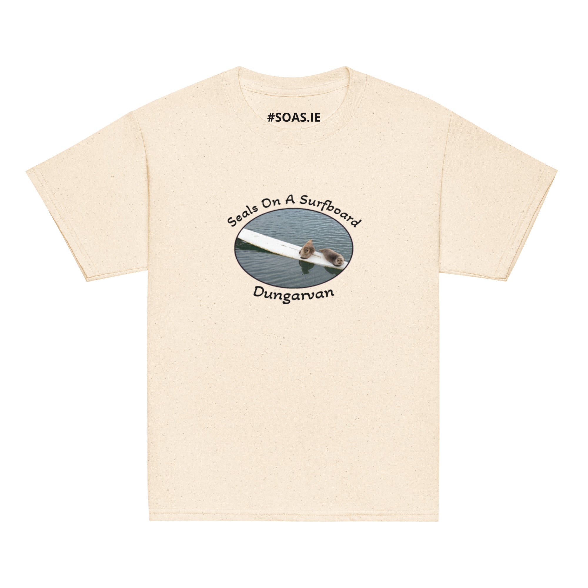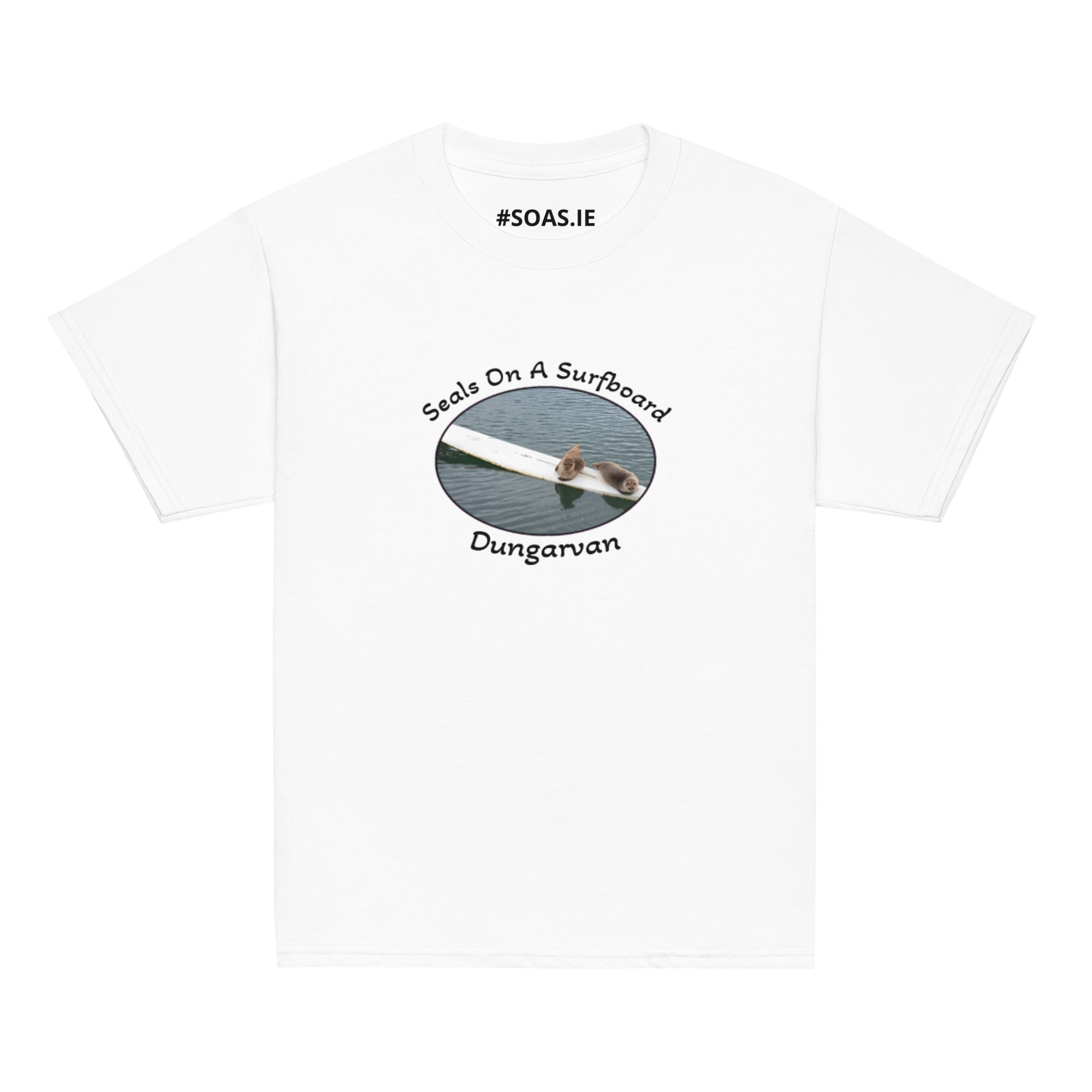 Kids memento TShirt of OFFICIAL Dungarvan seals on a surfboard.Investing in the youth classic tee means investing in a wardrobe... Read more