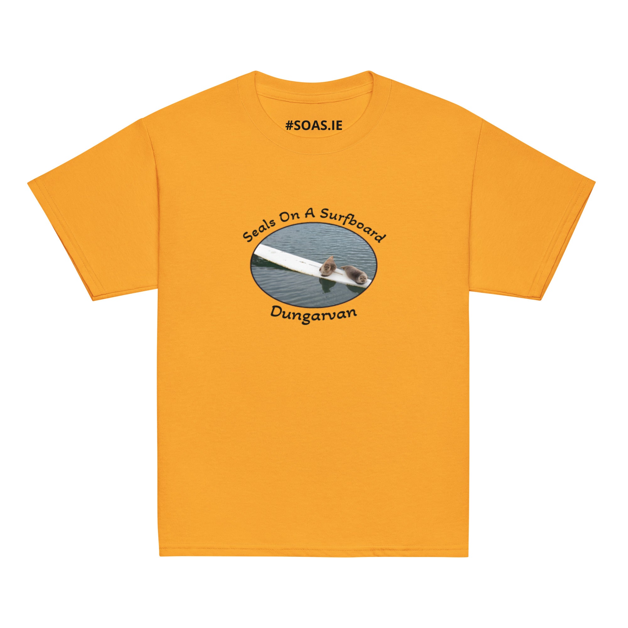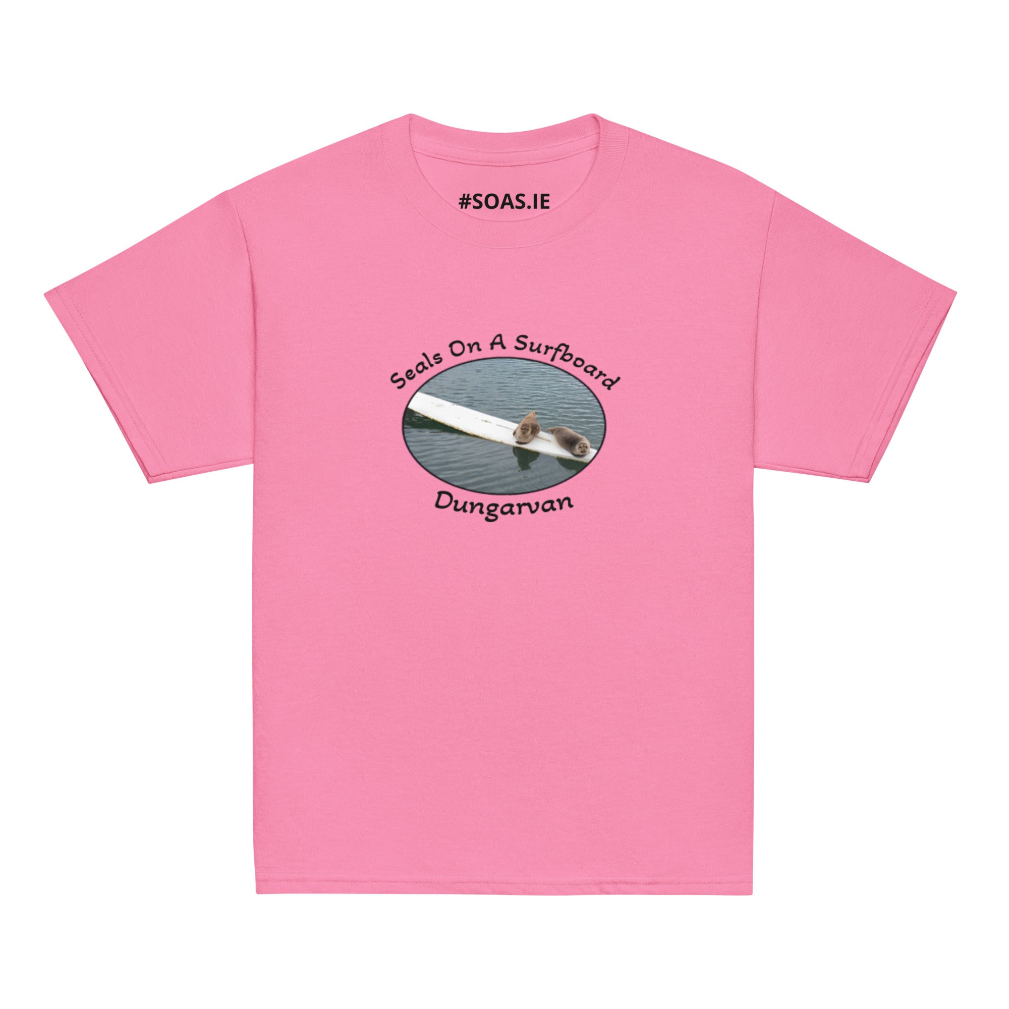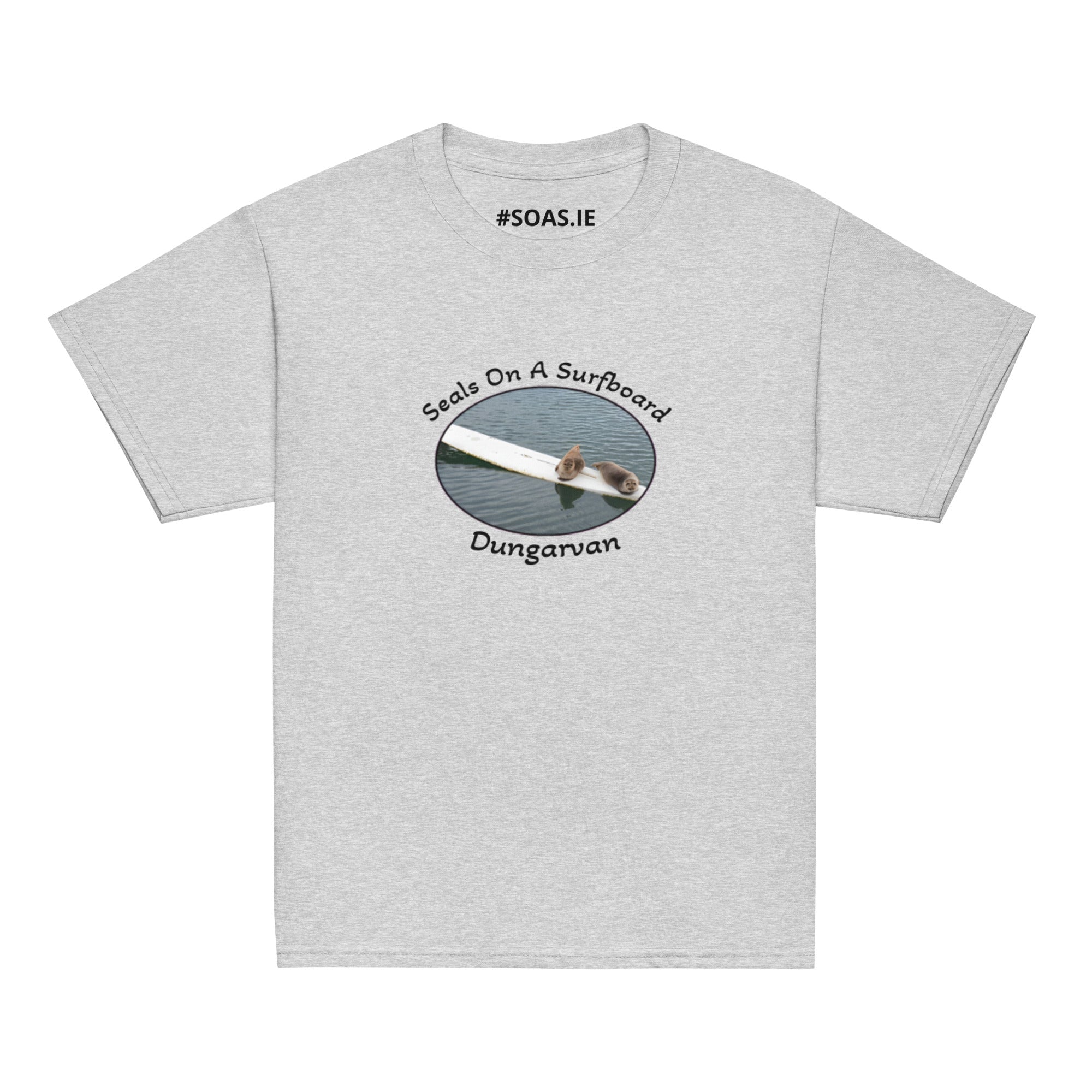 Kids memento TShirt of OFFICIAL Dungarvan seals on a surfboard.Investing in the youth classic tee means investing in a wardrobe... Read more